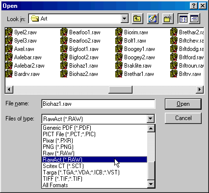 "RawAct" instead of "Raw" from the "Files of type" option. Like this: