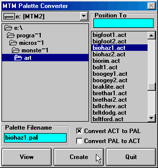 Check the "x" beside Convert ACT to PAL, browse to and select the ACT file that corresponds to the texture you want to work with, type the new palette name in the Palette Filename box (be sure to include the PAL extension), and finally click Create. A confirmation box will tell you the new palette has been made.