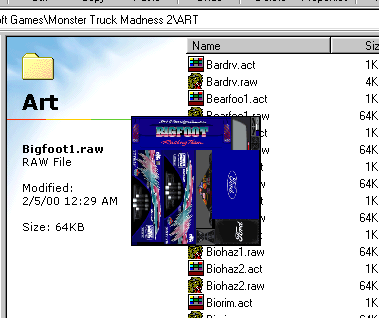 (Adobe Color Table - ACT Files) All the graphics in Monster Truck Madness 1 & 2 are in RAW and ACT file format. The RAW file is the image itself but this format contains very little information, so the game uses corresponding ACT files to know where the colors should go. Without the ACT file, mtm would be a black and white game. Traditionally, one of the hardest parts about creating custom textures was dealing with ACT files. The letters A.C.T. stand for Adobe Color Table which is a standard color palette for Photoshop by Adobe. This meant that unless you owned Photoshop, you were out of luck. And, of course, the problem was/is that Photoshop is very expensive. Thankfully, there are a lot of industrious programmers out there due to whose talents we are no longer a slave to Photoshop, we can use almost any program to work with textures, and, as a result, our workload has been cosiderably reduced. This page will look at four methods for dealing with ACT files. The Photoshop method with a new twist Photoshop Nice if you have it but few people do, so I won't belabor the point at length here except to say that Terminal Reality has come out with a nifty little plug-in that makes loading Raw and Act files simple. First, download the plugin.